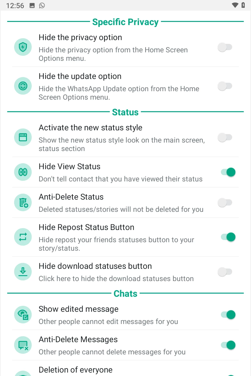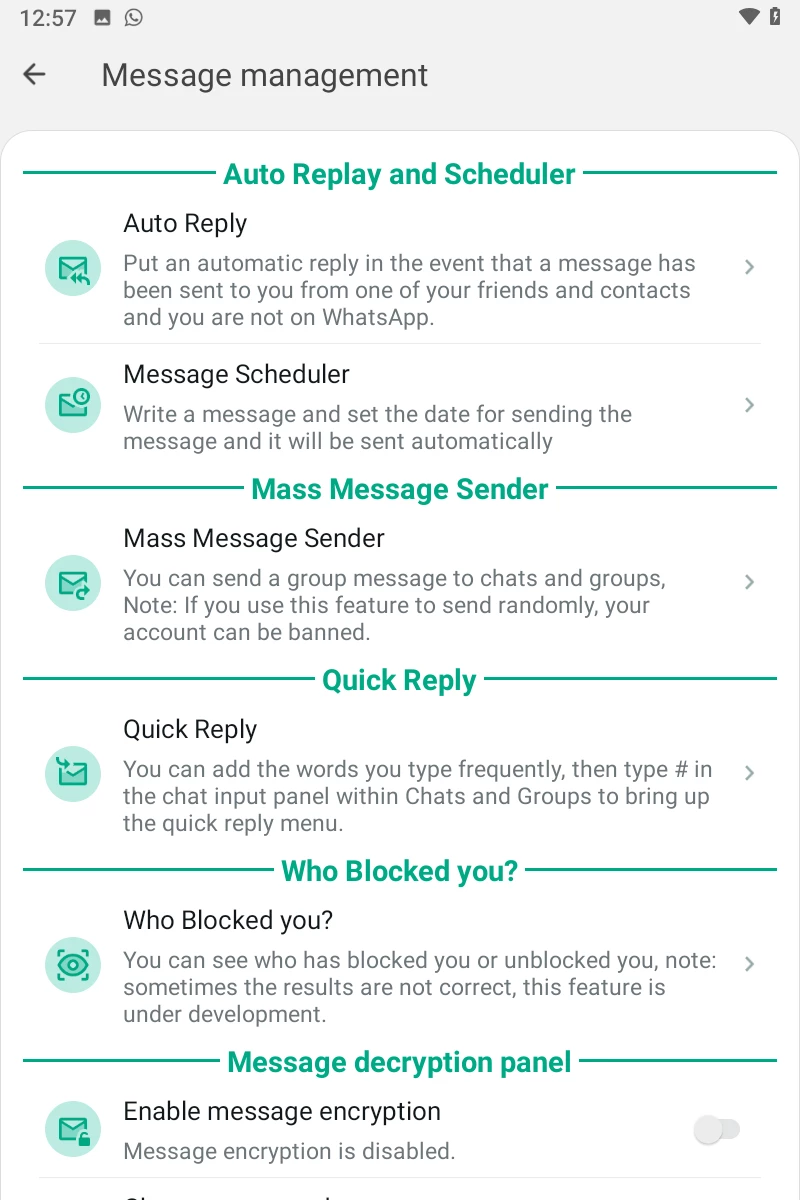 O recurso anti-banimento, com uma camada adicional de segurança, permite que você se sinta à vontade ao usar o aplicativo. Não há risco de ser banido pelo aplicativo oficial, como acontece com outras versões modificadas do WhatsApp.